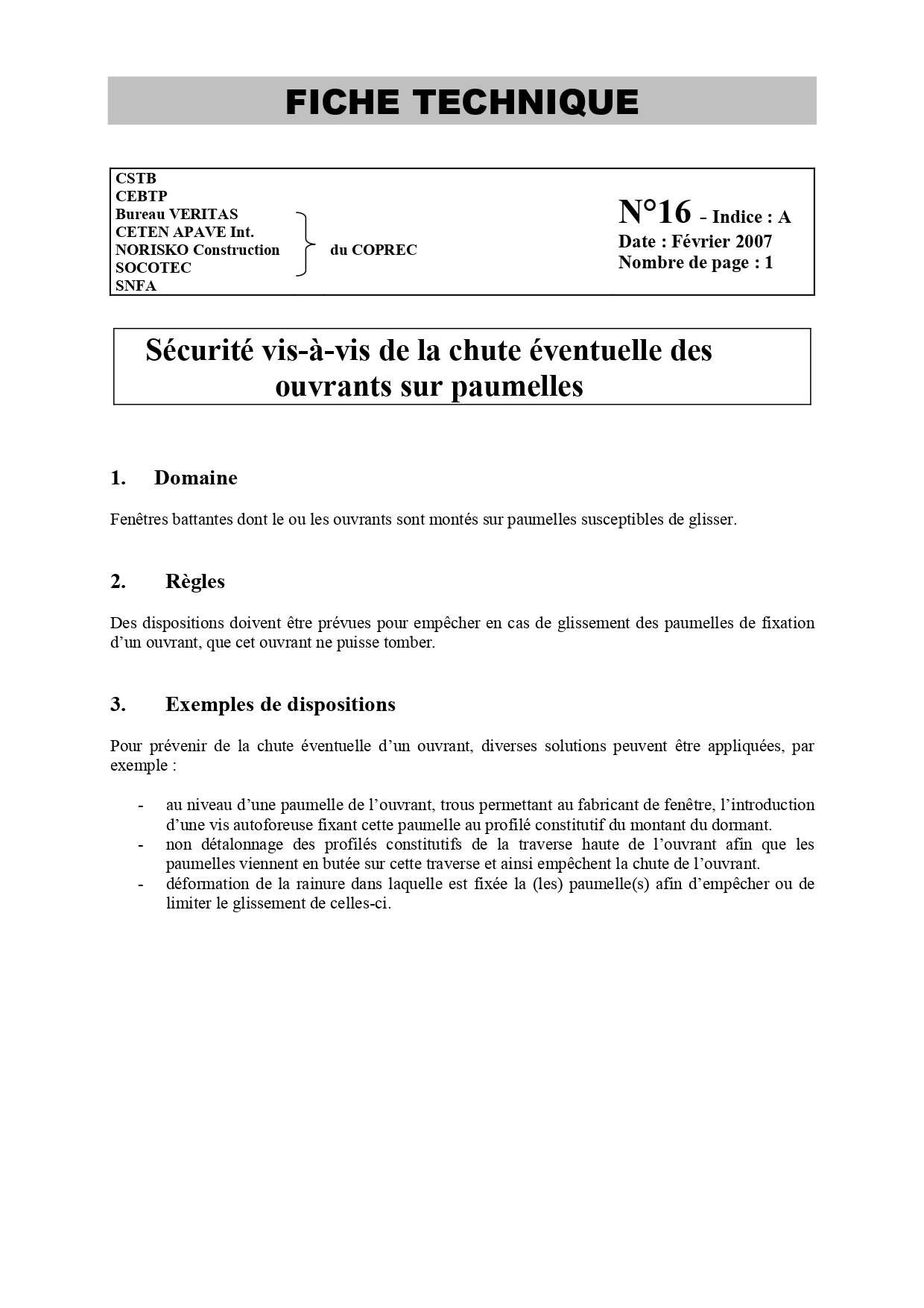 Fiche Technique n°16 – A : Sécurité de la chute éventuelle des ouvrants sur paumelles